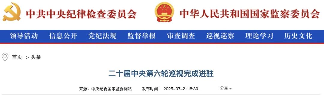 7月21日,中纪委官网发文:截至7月20日二十届中央第六轮巡视完成进驻工作。