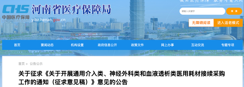 近日,河南医保局对《关于开展通用介入类、神经外科类和血液透析类医用耗材接续采购工作的通知(征求意见稿)》征求意见。