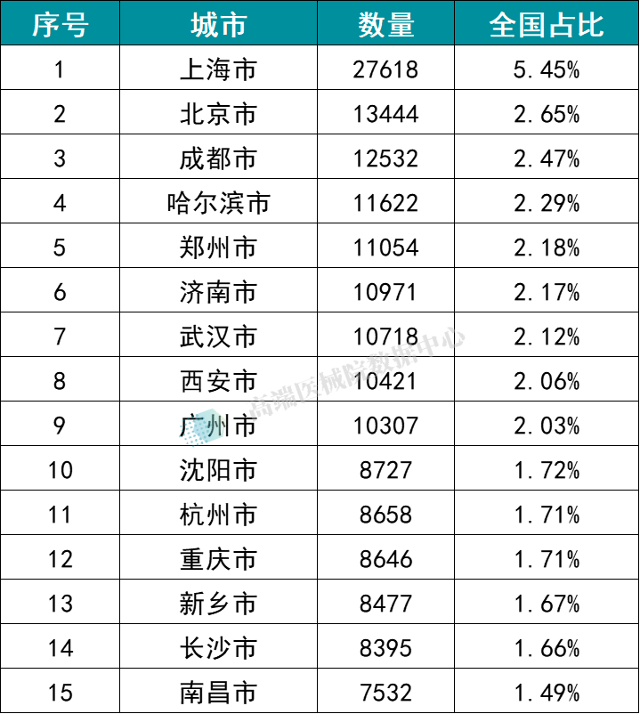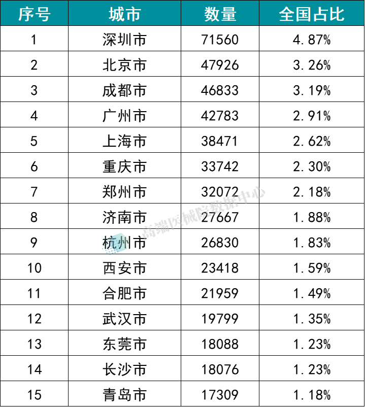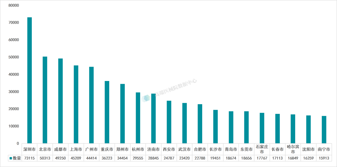 从城市分布上看,深圳市以73115家位列全国医疗器械经营企业数量排名第一,北京市(50313家)、成都市(49250家)分别位列第二、第三。其后全国排名前十的城市分别是 上海市、广州市、重庆市、郑州市以及济南市。