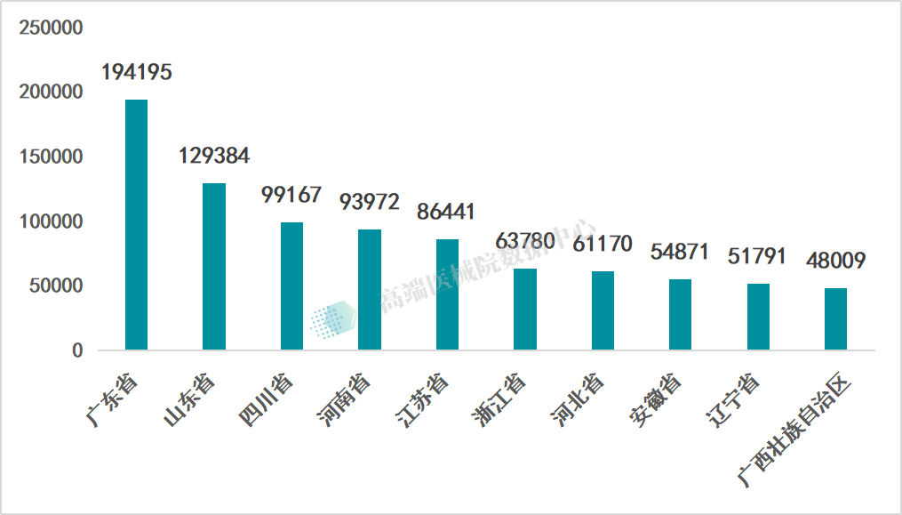 可经营Ⅱ类产品企业数量排名前三的省份分别为广东省(194195家)、山东省(129384家)、四川省(99167家),全国占比分别为13.22%、8.81%、6.75%。