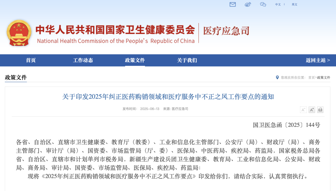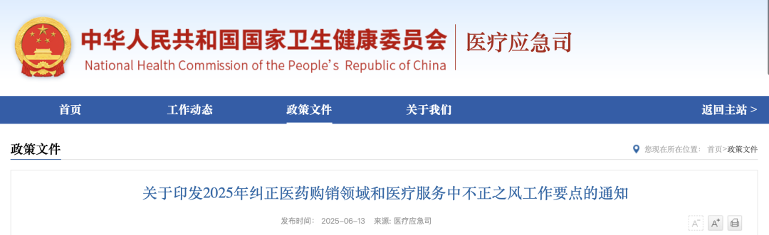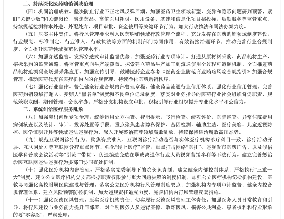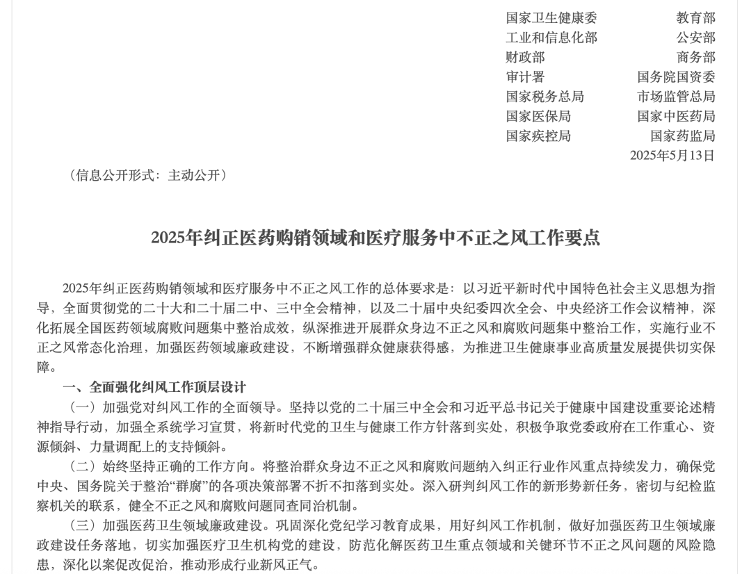 文件由国家卫生健康委、教育部、工业和信息化部、公安部、财政部、商务部、审计署、国务院国资委、国家税务总局、市场监管总局、国家医保局、国家中医药局、国家疾控局、国家药监局等全国纠正医药购销领域和医疗服务中不正之风部际联席工作机制14部委联合制定印发。