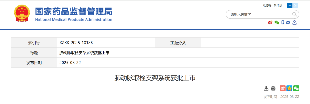 2025年8月22日,国家药品监督管理局(NMPA)一次性批准了两项创新医疗器械注册申请——晨兴(南通)医疗器械有限公司的“肺动脉取栓支架系统”和江苏畅医达医疗科技有限公司的“颅内动脉瘤辅助栓塞支架”。