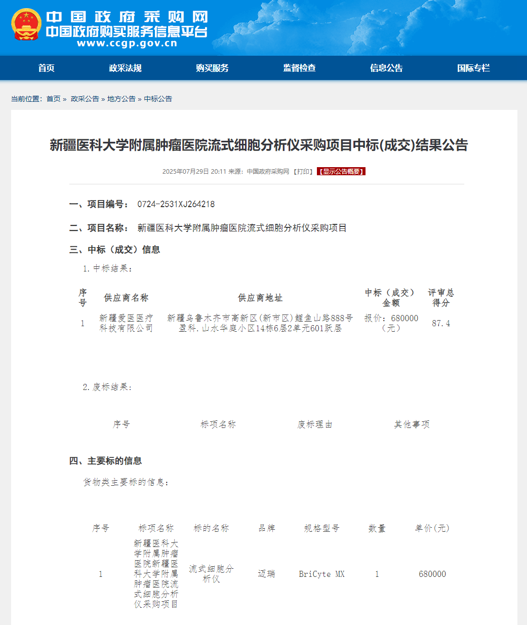 8月9日,中国政府采购网发布《国义招标股份有限公司关于新疆医科大学附属肿瘤医院流式细胞分析仪采购项目更正公告》。