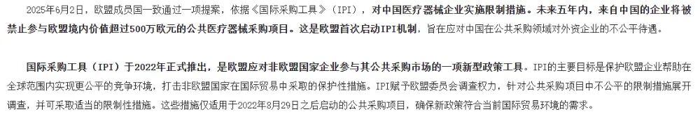 2025年6月30日,欧盟正式启动《国际采购工具》(IPI)禁令(依据:欧盟委员会实施条例)