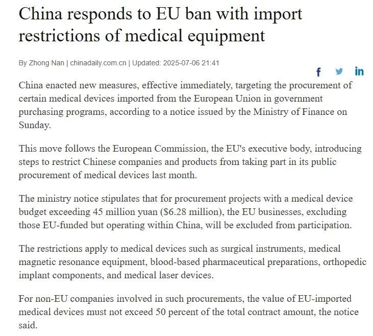 中国输欧耗材占比近半,欧盟对华依赖可能引发供应中断;而欧盟高端设备进入中国县级医院的道路也被政策阻断。