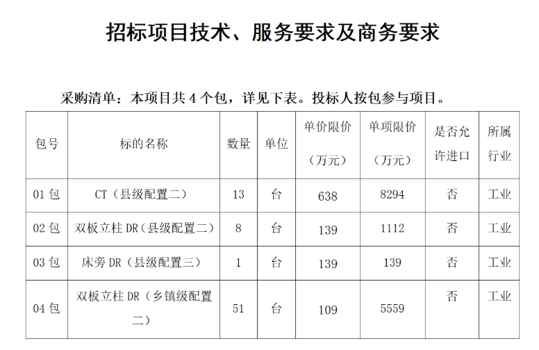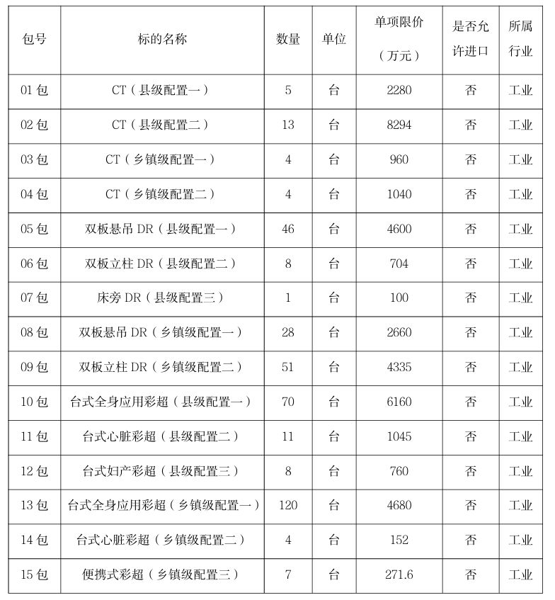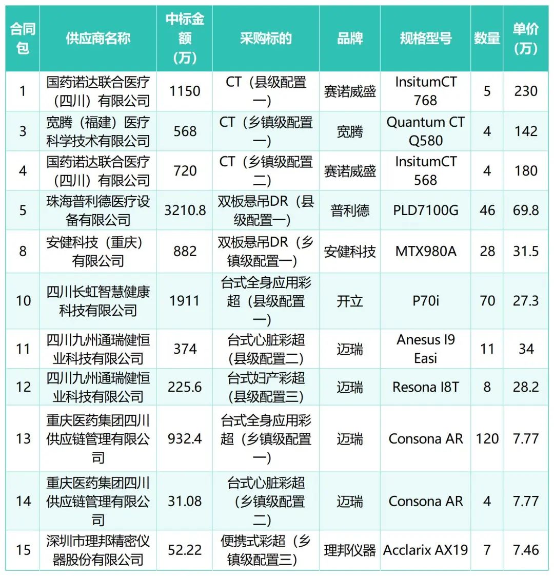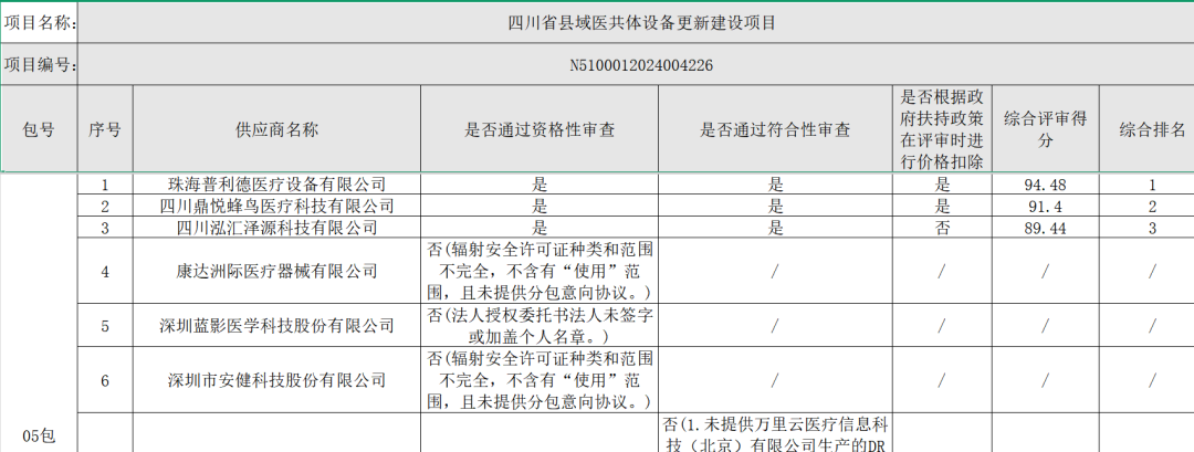 2024年12月27日,四川采购网发布四川省县域医共体设备更新建设项目公开招标采购公告。公告显示,该项目是为贯彻落实《国务院关于印发<推动 大规模设备更新和消费品以旧换新行动方案>》精神,根据四川省县域医共体建设需求,采购CT、DR、彩超机3类设备,用于四川省县域医共体设备更新。项目包含15个包,预算金额437,500,000元,均不允许进口产品投标。2025年1月24日,11个包的中标结果公布,中标总金额约为1亿元,节省了1.4亿元的预算。由于递交投标文件的投标人不足三家,合同包2、6、7、9流标。另外,项目补充事宜显示5包、8包中标人享受了中小企业扶持政策。可以看到5包中标金额为3210.8万,是当中最大的包,由珠海普利德医疗设备有限公司中标。项目评审文件显示,该标段共有9家供应商投标,其中3家企业通过了资格性和符合性审查,依照综合得分排名1/2/3,分别是:珠海普利德医疗设备有限公司、四川鼎悦蜂鸟医疗科技有限公司以及四川泓汇泽源科技有限公司。