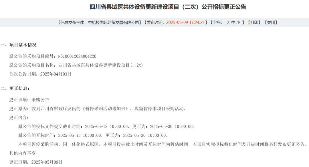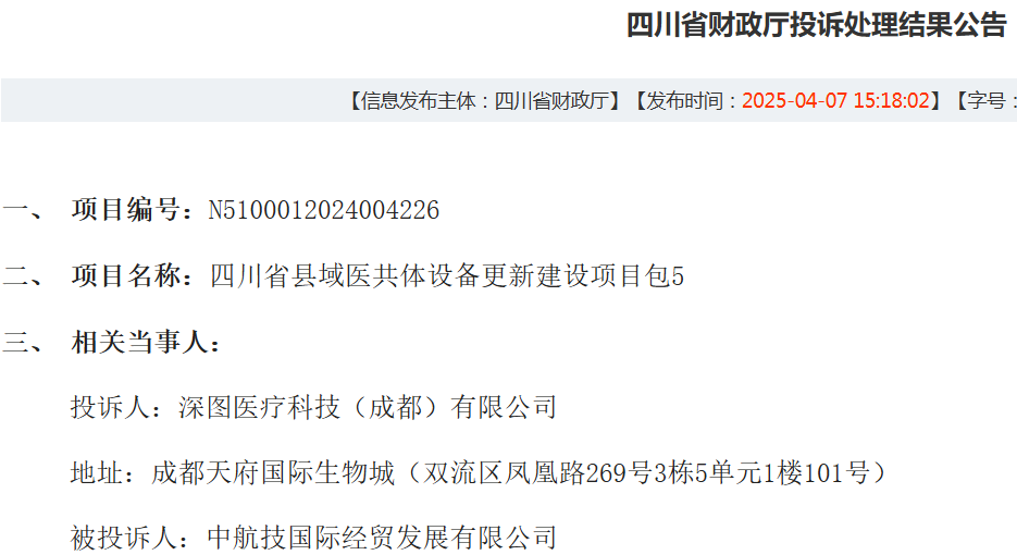 昨日,四川省财政厅发布了一则投诉处理公告,该投诉涉及四川省县域医共体设备更新建设项目,项目最早于去年12月发布,包含CT、DR、彩超机3类设备,预算金额为4.375亿。