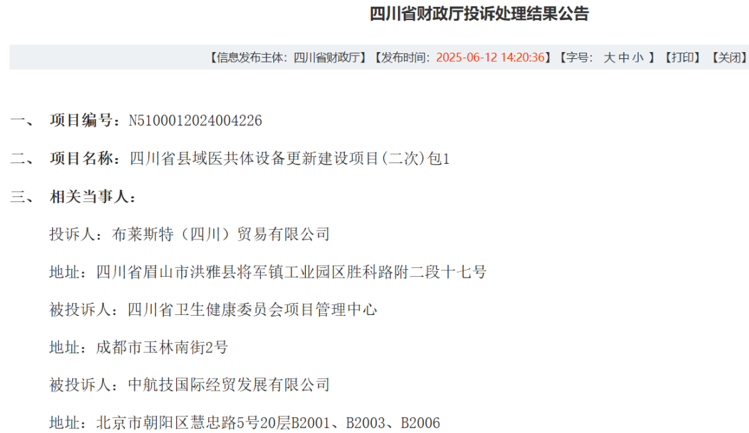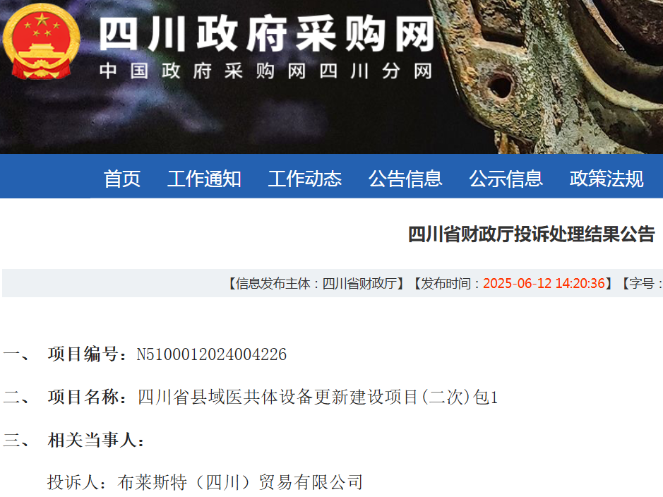 4月3日,四川省县域医共体设备更新建设项目(二次)公开招标采购公告发布,项目共四个包,标的为CT、DR设备,预算金额151,040,000元。5月9日,该项目因受到四川省财政厅发布的出的《暂停采购活动通知书》,被按下暂停键。6月9日,公告显示接财政厅通知,本次采购活动终止。几天后,6月12日网站发布了投诉处理结果公告。该公告显示,布莱斯特(四川)贸易有限公司投诉了四川省卫生健康委员会项目管理中心。所投诉的项目正是上述项目中预算最大的包1,13台县级配置CT,单价限价638万,总价限价8294万。投诉事项包括: