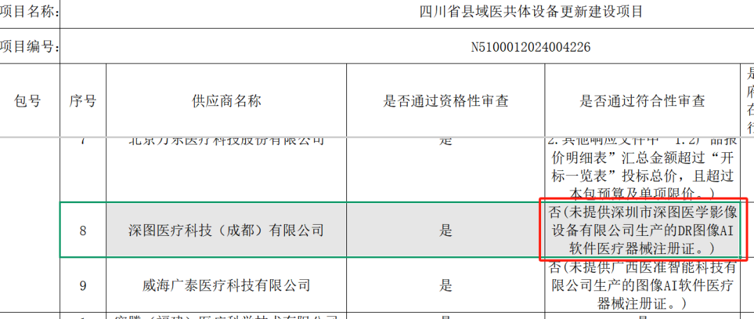 投标企业中,深图医疗科技(成都)有限公司通过了资格性审查,未能通过符合性审查。原因是未提供深圳市深图医学影像设备有限公司生产的DR图像AI软件医疗器械注册证。