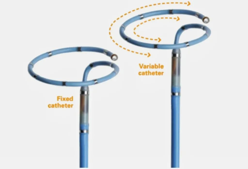导管设计细节彰显工程智慧:环形头端上带有10个电极,尺寸可调(25-35mm),可双向调弯(一侧180°,另一侧90°),能适应包括右下肺静脉在内的所有肺静脉解剖结构。