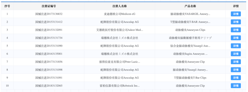 (动脉瘤夹获批产品,截图自国家药监局)