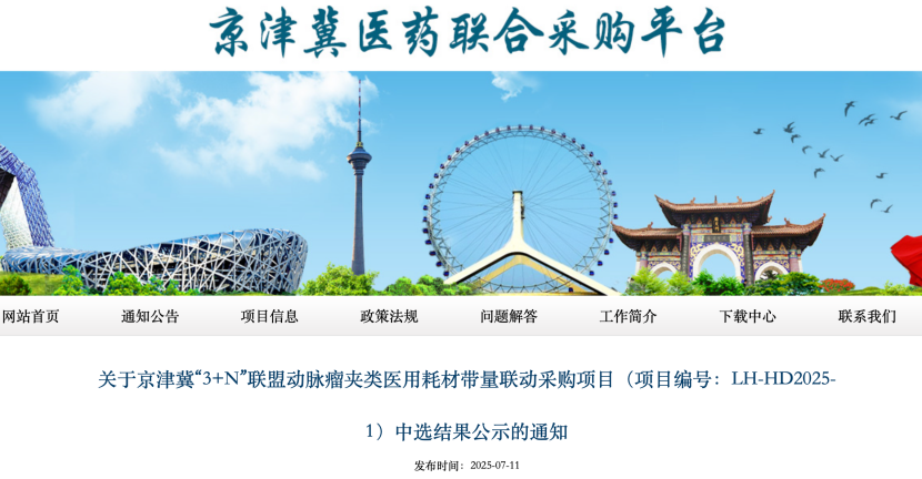 7月11日,天津市医药采购中心发布《关于京津冀“3+N”联盟动脉瘤夹类医用耗材带量联动采购项目(项目编号:LH-HD2025-1)中选结果公示的通知》,共有5家企业中选,中选产品全部为进口。