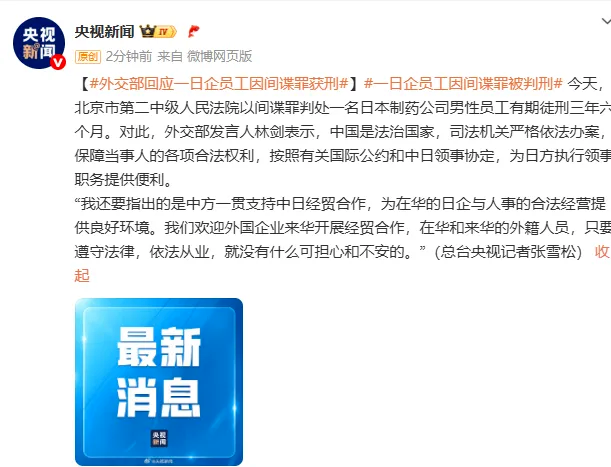 2025年7月16日,北京市第二中级人民法院以间谍罪判处一名日本制药公司男性员工有期徒刑三年六个月。
