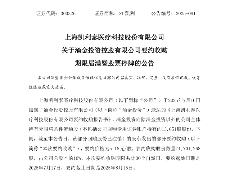 2025 年 7 月 16 日,凯利泰披露了涌金投资送达的《上海凯利泰医疗科技股份有限公司要约收购报告书》。