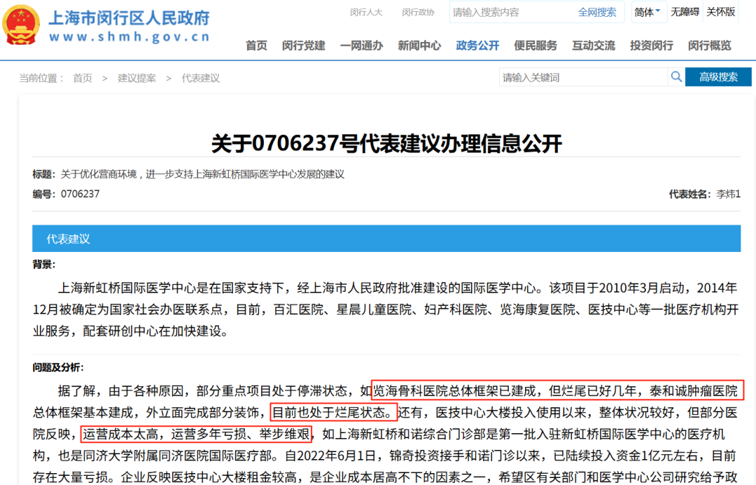 上海市闵行区人民政府网站公开的一则代表建议,让该区域部分医疗机构烂尾、建设停滞的情况重新进入公众视野。