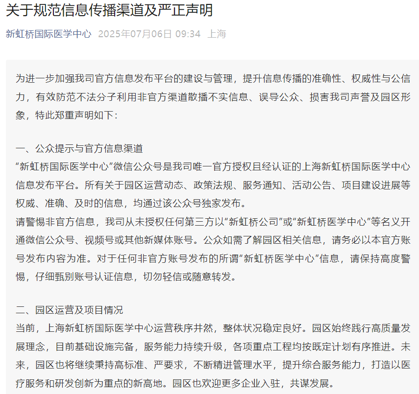 相关新闻发酵后,上述建议中提到的上海新虹桥国际医学中心,发布严正声明称:
