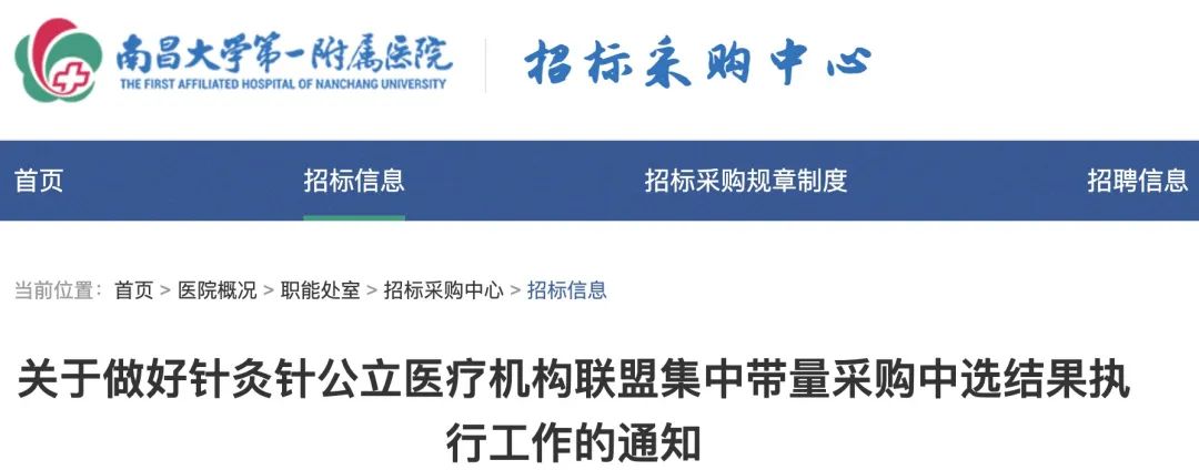 7月14日,南昌大学第一附属医院发布《关于做好针灸针公立医疗机构联盟集中带量采购中选结果执行工作的通知》(简称《通知》)。