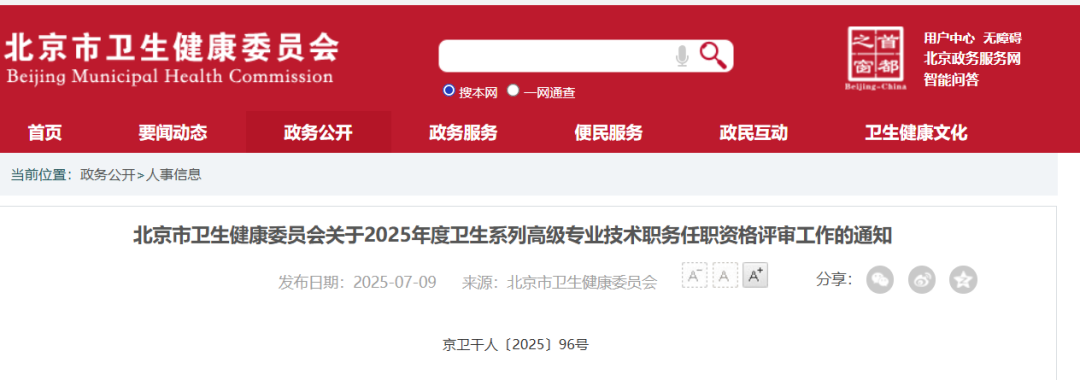 7月9日,北京市卫生健康委发布了《关于2025年度卫生系列高级专业技术职务任职资格评审工作的通知》(以下简称《通知》),其中对申报时间、条件、材料提报等方面做出了详细规定。