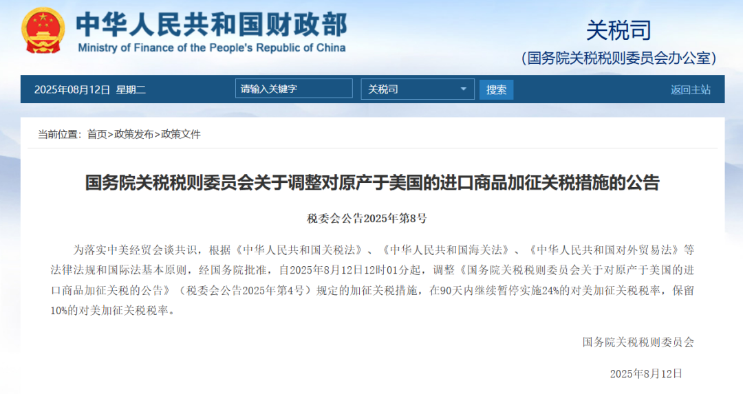 二、中国将继续(一)修改税委会公告2025年第4号规定的对美国商品加征的从价关税的实施,自2025年8月12日起再次暂停实施24%的关税90天,同时保留对这些商品加征的剩余10%的关税;并(二)根据日内瓦联合声明的商定,采取或者维持必要措施,暂停或取消针对美国的非关税反制措施。