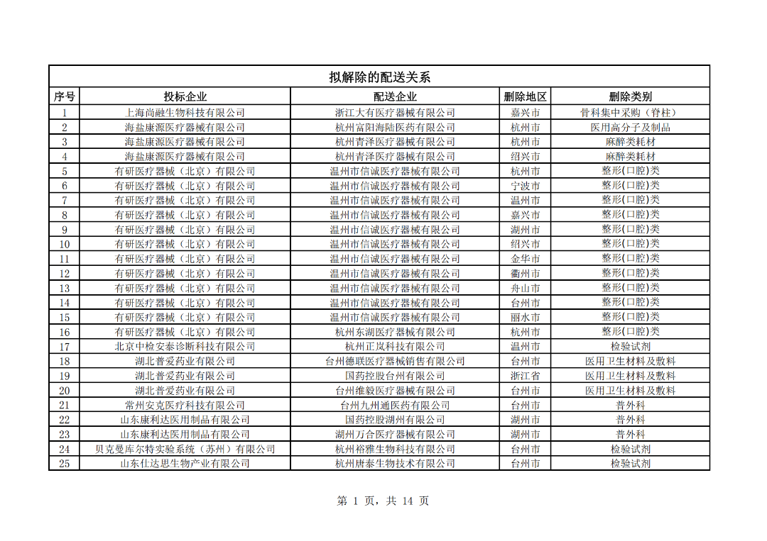 7月14日,浙江省医保局发布《关于医用耗材生产(供应)企业解除配送关系事项的公示(2025年第6批)》,拟一次性解除350组耗材配送商合作关系。