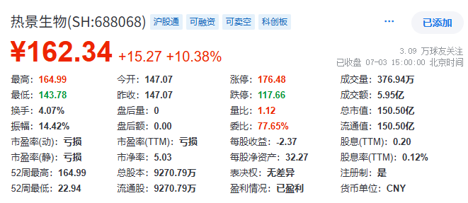 7月3日,热景生物股价大涨。截至今日收盘,热景生物上涨10.38%,收盘价为162.34元,收盘价创历史新高!