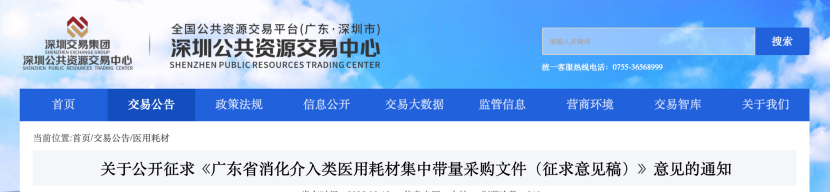 8月12日,深圳公共资源交易中心发布《广东省消化介入类医用耗材集中带量采购文件(征求意见稿)》。