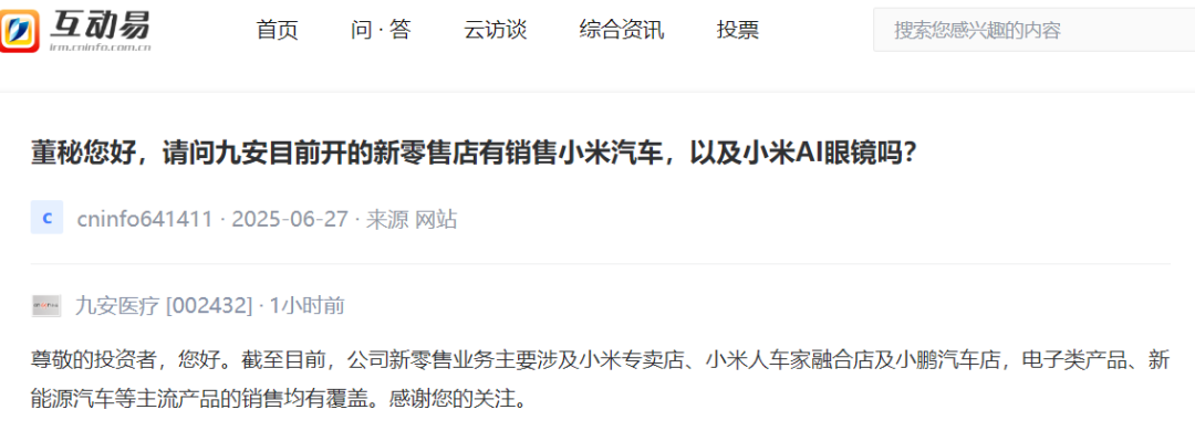 7月7日,九安医疗在互动平台回答投资者提问时表示,公司新零售业务主要涉及小米专卖店、小米人车家融合店及小鹏汽车店,电子类产品、新能源汽车等主流产品的销售均有覆盖。