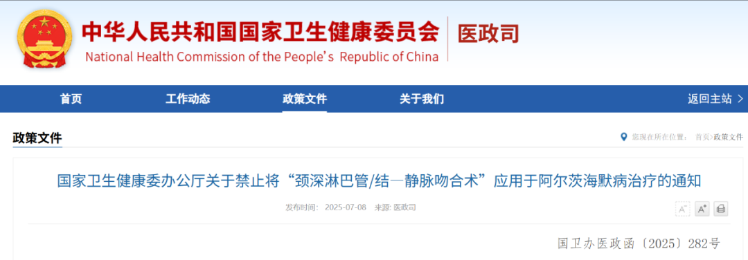 我委近期获悉有个别医疗机构开展“颈深淋巴管/结—静脉吻合术”治疗阿尔茨海默病,为进一步加强医疗技术临床应用管理,我委组织专家对该技术进行评估,评估认为该技术处于临床研究早期探索阶段,适应证及禁忌证尚不明确,安全性、有效性缺乏高质量循证医学证据支撑。根据《医疗技术临床应用管理办法》(国家卫生健康委员会令 第1号)有关规定,决定禁止将“颈深淋巴管/结—静脉吻合术”应用于阿尔茨海默病治疗。