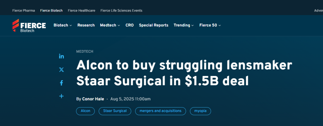 2025 年 8 月 5 日,全球眼科医疗巨头爱尔康(Alcon)宣布以 15 亿美元(约合107亿元人民币)收购纳斯达克上市公司 Staar Surgical,每股 28 美元的现金报价较其 90 天平均股价溢价 59%,较前一日收盘价溢价 51%。