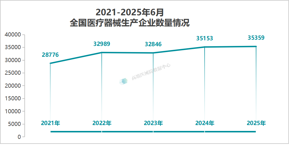 据高端医械院数据中心统计,截至2025年6月30日,全国境内医疗器械生产企业达35359家,较2024年底(35153家)增长5.86%。
