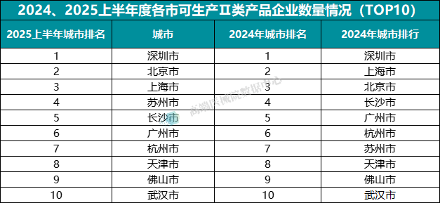 根据2025年上半年度可生产Ⅱ类产品企业的最新TOP10可以发现,相较于2024年,半年间北京市与苏州市的排名均有所提高,苏州更是一举前进三位,来到第四名。在企业的增减量上增加了150家企业,增长率达到了27.73%,其次是天津市的增量达到29家,增长率达到了11.95%。