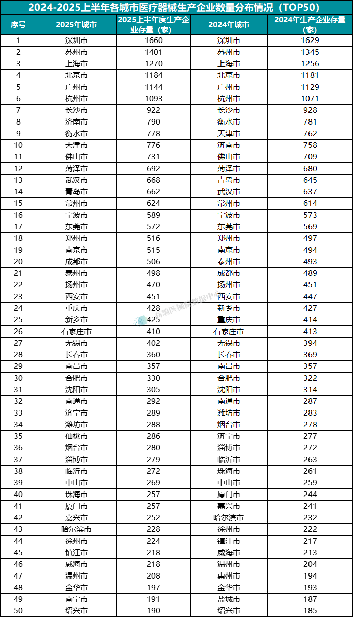 从城市分布来看,截至2025年6月30日,全国医疗器械生产企业数量排名第一的城市是深圳市,生产企业数量为1660家;苏州市紧随其后,生产企业数量为1401家;排名第三的是上海市1270家。