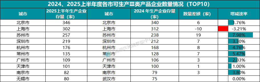 在这半年间,可生产Ⅲ类产品生产企业数量前十的城市较2024年底,增速最大的为苏州市(7.98%),增长最多的也同样是苏州,增长数量达到了19家,下降比例最明显的是上海市(-3.21%),也是TOP10中唯一出现了减少的城市,半年间减少了10家企业。