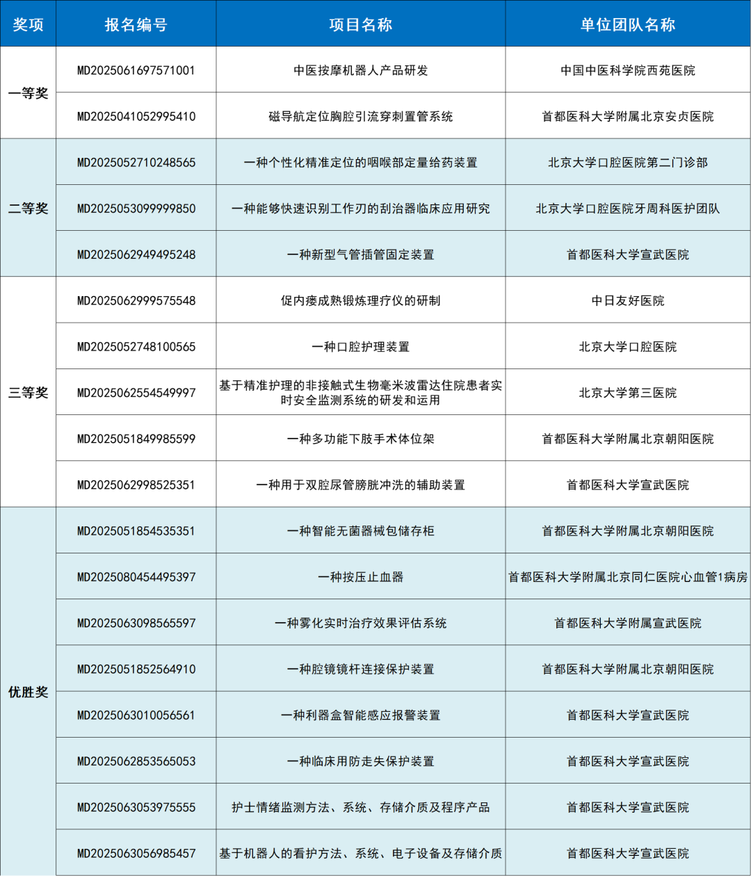 本届医院专场赛(北京)汇聚了来自首都医科大学宣武医院及北京天坛医院、北京安贞医院、北京同仁医院、北京朝阳医院、北京儿童医院、北京友谊医院、北京口腔医院、北京协和医院、中国医学科学院肿瘤医院等首都三甲医疗机构的临床创新项目,分为护理组和医生组,项目内容涉及AI+医疗软硬件、可穿戴设备、康复护理等诸多方向。