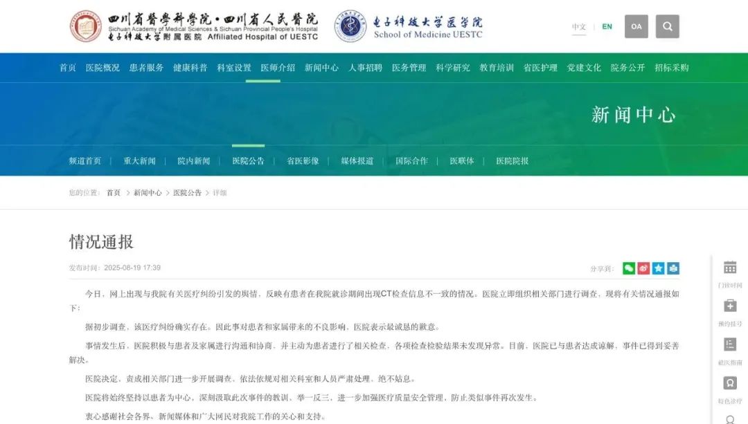 今日(8月19日),网上出现与我院有关医疗纠纷引发的舆情,反映有患者在我院就诊期间出现CT检查信息不一致的情况。医院立即组织相关部门进行调查,现将有关情况通报如下: