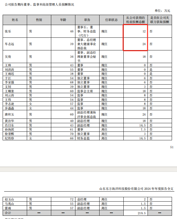 从公司 2024 年年报数据来看,剔除独立董事、监事会主席、监事后,东方海洋14位董事和高级管理人员平均薪酬为21万元,车志远的薪酬高于平均水平。