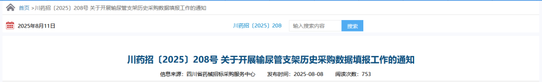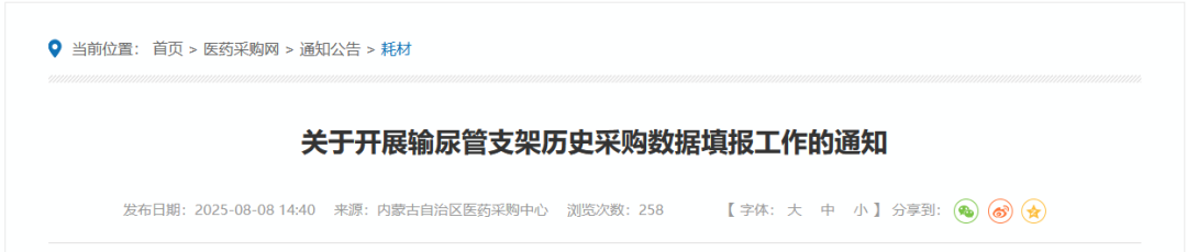 近日,输尿管支架历史采购数据填报工作正式启动,目前四川省、内蒙古自治区已正式开展相关信息填报工作。