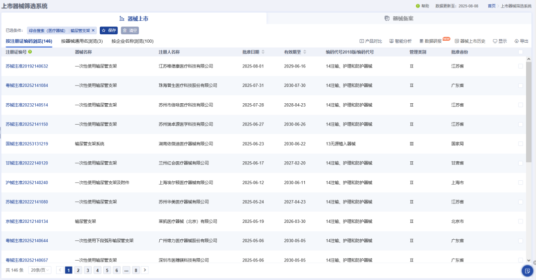 据药智医械数据查询显示,目前我国共上市100余款输尿管支架类产品,从该类耗材布局企业来看,不乏外资巨头和本土创新械企。外资品牌中波科、奥林巴斯等企业曾一度占据主导地位,不过本土创新械企在近年来发展突飞猛进,已涌现出如微创优通医疗、湖南瑞邦医疗等颇具潜力的企业。