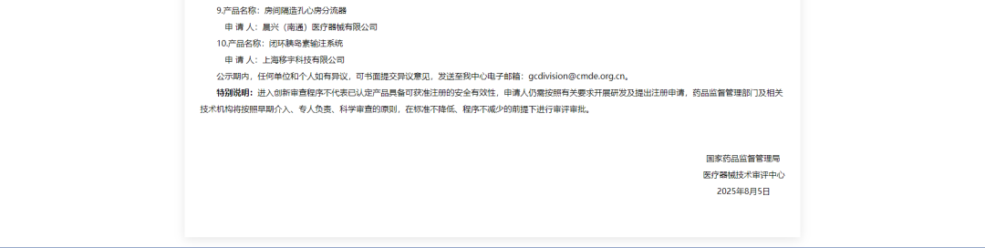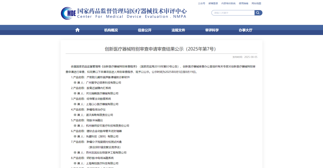 依据国家药品监督管理局《创新医疗器械特别审查程序》(国家药监局2018年第83号公告),创新医疗器械审查办公室组织有关专家对创新医疗器械特别审查申请进行审查,拟同意以下申请项目进入特别审查程序,现予以公示。公示时间为2025年8月5日至8月19日。